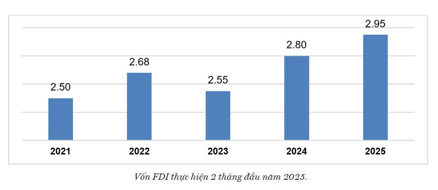 Theo Cục Thống kê, vốn FDI thực hiện trong hai tháng đầu năm 2025 ước đạt 2,95 tỷ USD (tăng 5,4% so với cùng kỳ) và là mức cao nhất trong 5 năm qua. Ngành công nghiệp chế biến, chế tạo tiếp tục chiếm ưu thế với 2,42 tỷ USD, chiếm 82,1% tổng vốn FDI thực hiện.