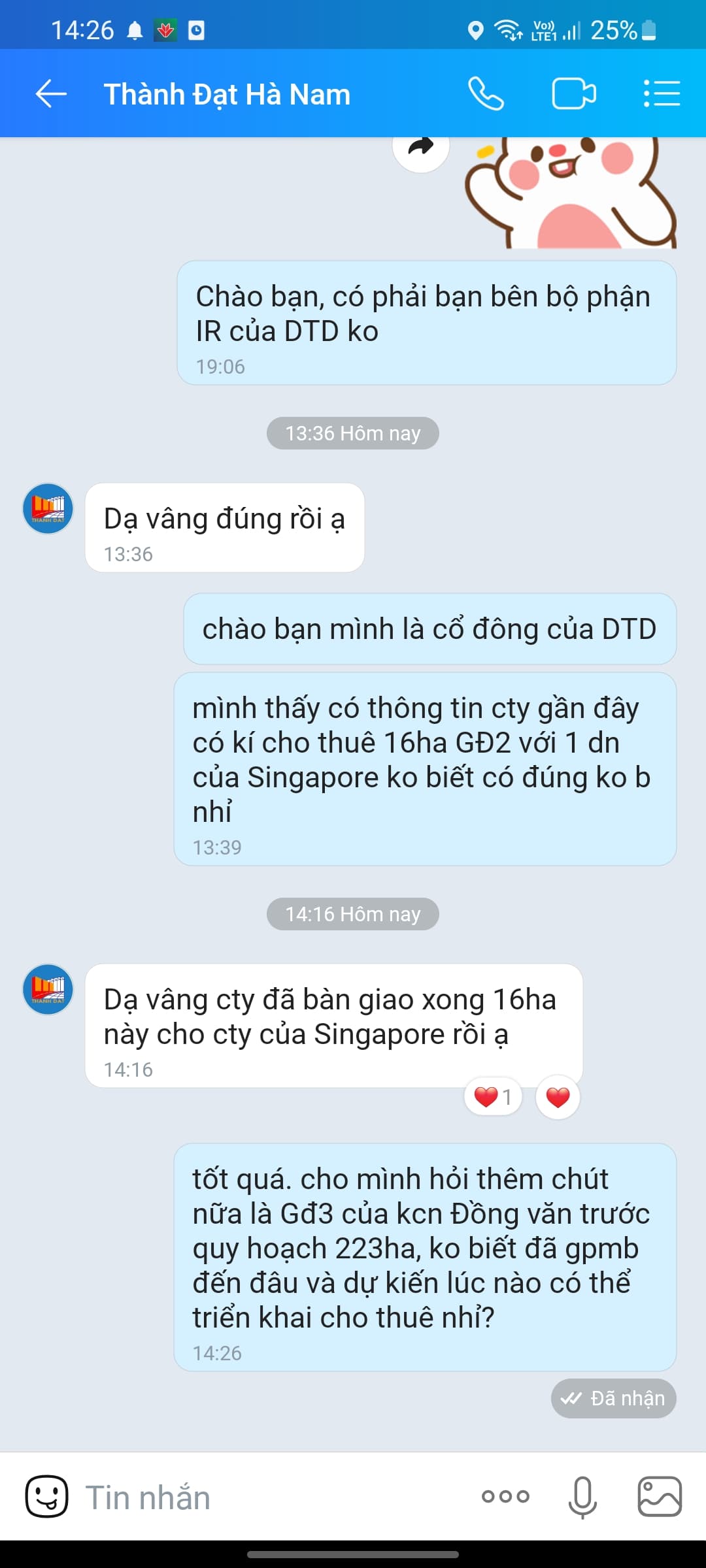 Cổ tức đều đặn 10-15%/1 năm, vốn hóa hiện tại 1k tỉ, so sánh với bọn trong ngành thì dạng penny thôi, vốn hóa DTD phải 4k ti hợp lí/