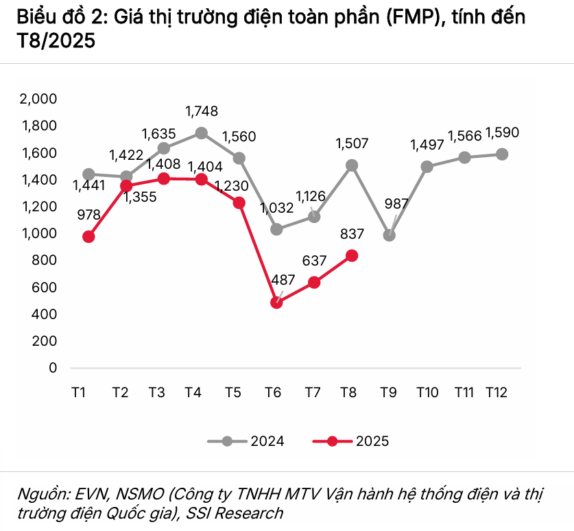 Thủy điện trở thành nguồn điện có tỷ trọng cao nhất trong quý 3, chiếm hơn 40% sản lượng toàn hệ thống, thay thế cho nhiệt điện than trong 6T2025, nhờ vào điều kiện thủy văn thuận lợi. Điều này cũng giúp cho nhiều cổ phiếu về thủy điện đạt kết quả kinh doanh tích cực như REE, VSH, HNA, SBH, CHP, TMP, SHP, TBC, SBA, S4A. Xu hướng này cũng góp phần lý giải phần nào cho việc giá thị trường điện toàn phần (FMP) giảm so với năm 2024, cùng với giá công suất (CAN) giảm so với cùng kỳ.