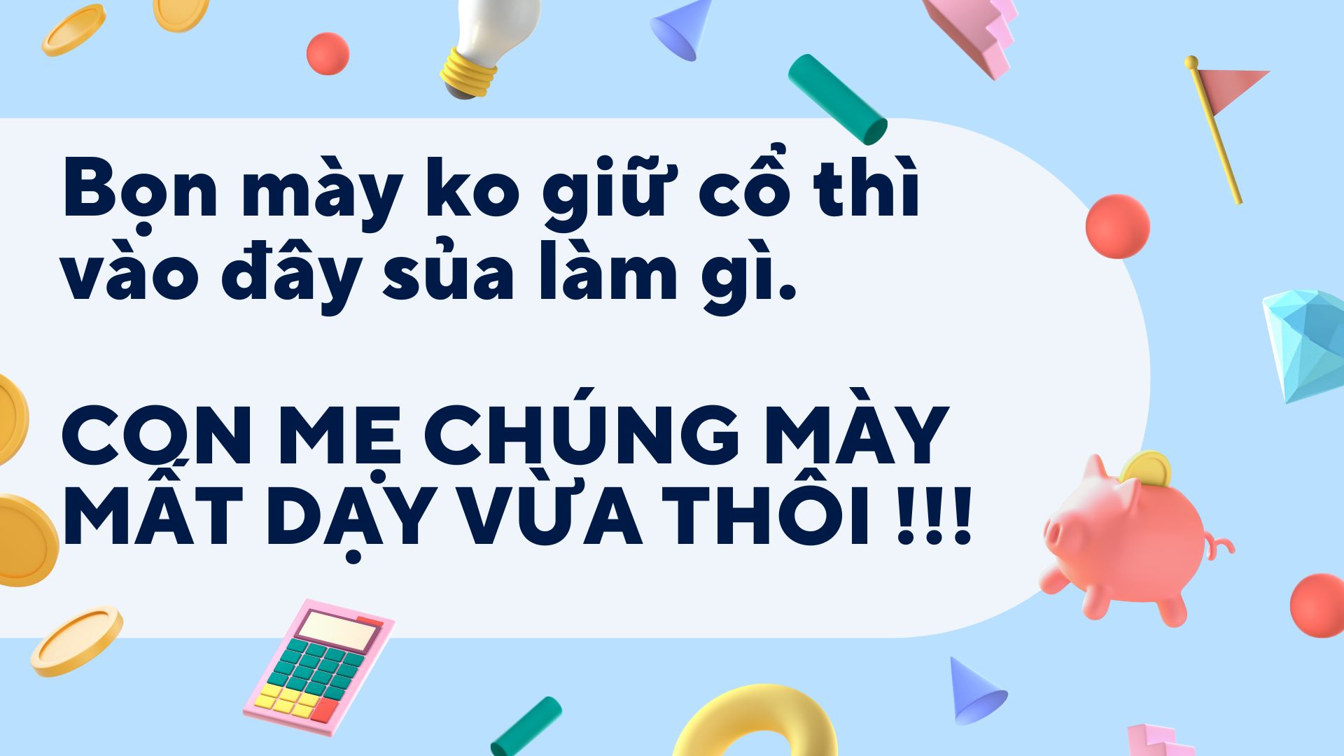 Đời nó lại ở chỗ đấy, hàng chục con chia 3 chia 4 thì chúng nó chỉ chăm chăm tìm Dig vs Ceo để chim, nghĩ nó hài vkl. Chắc là đu đỉnh vs full mazin nên cháy mẹ tk rồi. Giờ cay cú nên đi cắn xé.kkkk