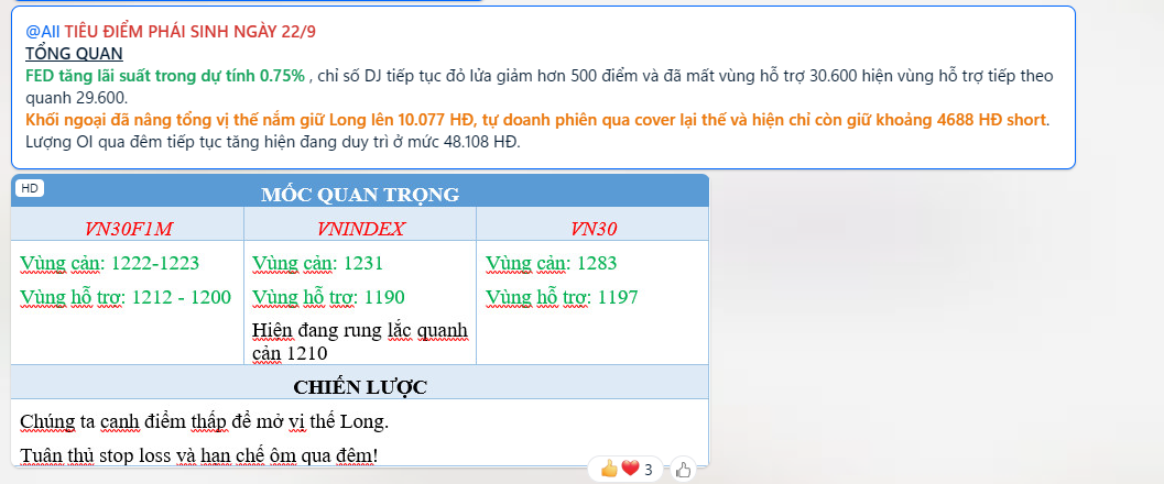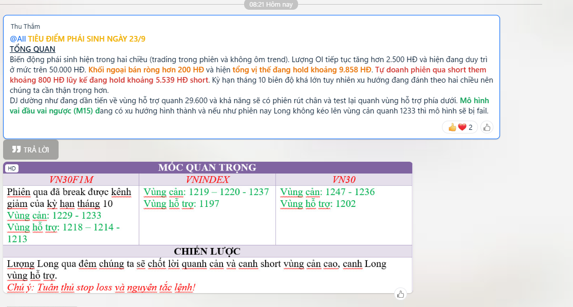 @All TIÊU ĐIỂM PHÁI SINH NGÀY 21/09 TỔNG QUAN Diễn biến phái sinh hiện đang trái chiều và lượng OI qua đêm đã lên gần 47.000 HĐ. Khối ngoại hiện lũy kế thống kê đang hold Long gần 10.000 HĐ và Tự doanh phiên qua short thêm 1685 HĐ và tổng vị thế đang nắm giữ là 6456 HĐ. DJ hiện tại đã mất vùng hỗ trợ 31.200 đang hiệu chỉnh US Index. Kỳ vọng đóng nến tuần sẽ không thủng mốc hỗ trợ.
