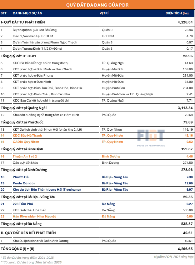 6 dự án trọng điểm trong năm 2025-2027, chỉ là một phần nhỏ trong quỹ đất 4,266 ha của PDR, đa dạng, pháp lý sẵn sàng bao gồm nhiều dự án tọa lạc tại những vị trí đắc địa trải dài từ miền Trung đến miền Nam Việt Nam.