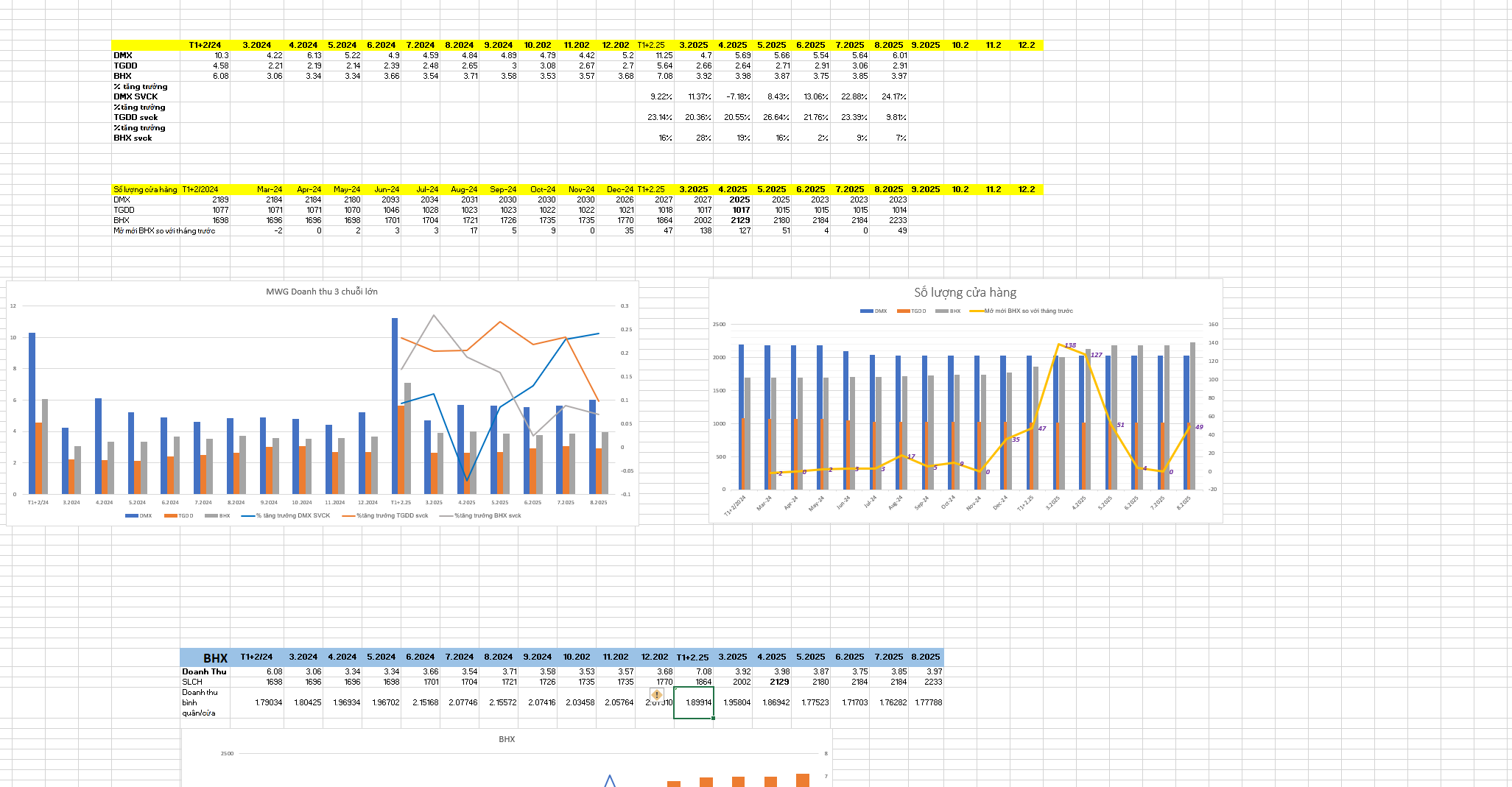 Chuỗi BHX đã hoàn thành kế hoạch mở mới, kỳ vọng đẩy mạnh doanh thu và lợi nhuận trong nửa cuối năm. BHX đã có lãi quý thứ 5 liên tiếp. Trong 6T2025, BHX đã mở mới thêm 414 cửa hàng và nửa cuối năm sẽ tập trung vào đẩy mạnh tối ưu hóa lợi nhuận. Trong Q2/2025, chuỗi BHX ghi nhận mức lãi 182 tỷ đồng, dự phóng LN nửa cuối năm khoảng 400 tỷ.