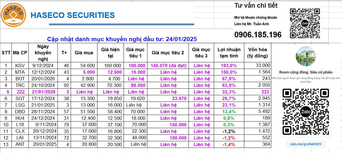 KSV: Lợi nhuận tạm tính 193% MTA: Lợi nhuận tạm tính 150% BOT: Lợi nhuận tạm tính 67,9% TRC: Lợi nhuận tạm tính 63,9% ZZZ: Lợi nhuận tạm tính 32,3% (đang thu gom) SGT: Lợi nhuận tạm tính 29,7% DBD: Lợi nhuận tạm tính 13,4%
