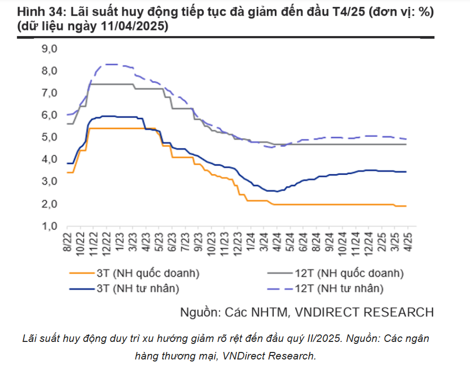 Theo VNDirect Research, “đà giảm lãi suất huy động phản ánh định hướng của Chính phủ và NHNN nhằm hạ chi phí vốn, thúc đẩy khả năng tiếp cận tín dụng của doanh nghiệp và người dân”.