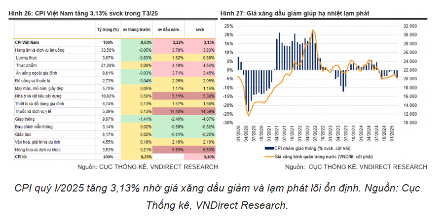 Lạm phát cũng đang được kiểm soát chặt chẽ. CPI bình quân quý I/2025 tăng 3,22% so với cùng kỳ năm trước, thấp hơn đáng kể so với mục tiêu trần 4,5–5% mà Chính phủ đề ra. VNDirect Research đánh giá “áp lực lạm phát hiện tại được kiểm soát tốt, tạo dư địa thuận lợi cho NHNN tiếp tục chính sách tiền tệ nới lỏng trong thời gian tới”.