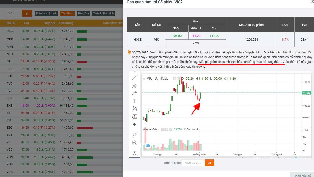 VIC sau những phiên cảnh báo mua vào giá thấp, cũng về giá thấp nhất đúng với gợi ý mà tín hiệu AI đưa ra, quanh giá 104. Ko dễ để bắt được đúng giá thấp nhất, nhưng thi thoảng hệ thống vẫn đưa ra gợi ý rất chính xác