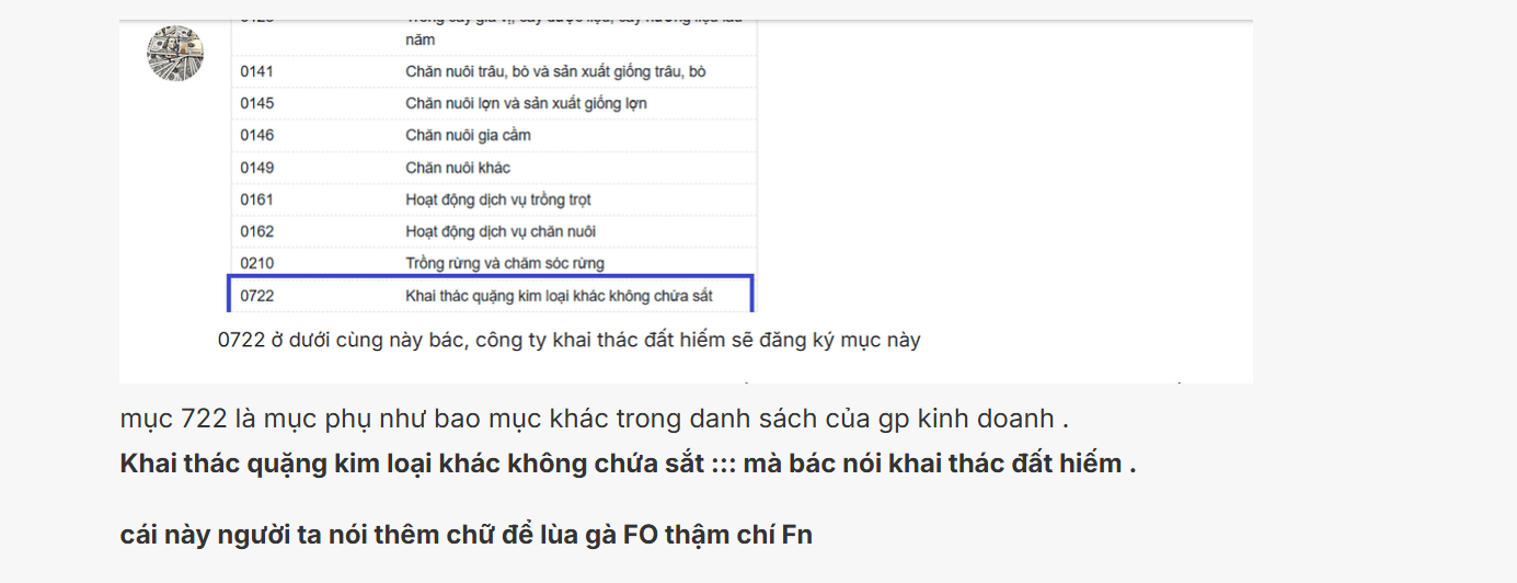 còn mục 722 : đây là mục phụ , còn thêm câu công ty sẽ đăng ký mục này khai thác đất hiếm .