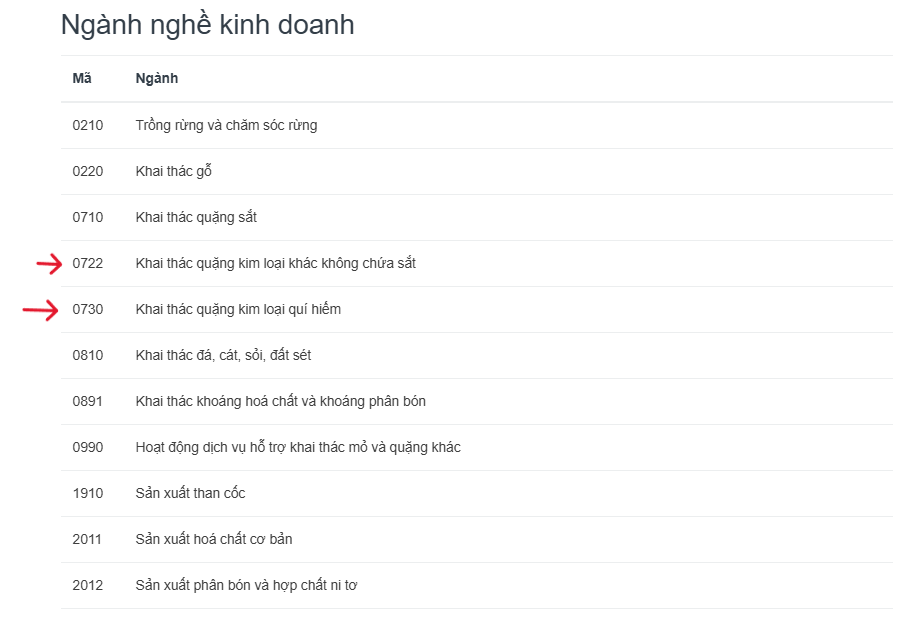 đây chỉ nói chung chung , còn cty nào khai thác kim loại gì thì mục 730 này liệt kê chi tết .