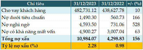 Tổng tài sản Ngân hàng tại cuối năm 2023 là 674,389 tỷ đồng, mở rộng 14% so với đầu năm. Trong đó, tiền gửi tại các TCTD khác gấp 2 lần đầu năm, tăng lên 50,114 tỷ đồng. Cho vay khách hàng tăng 10% lên mức 482,731 tỷ đồng.