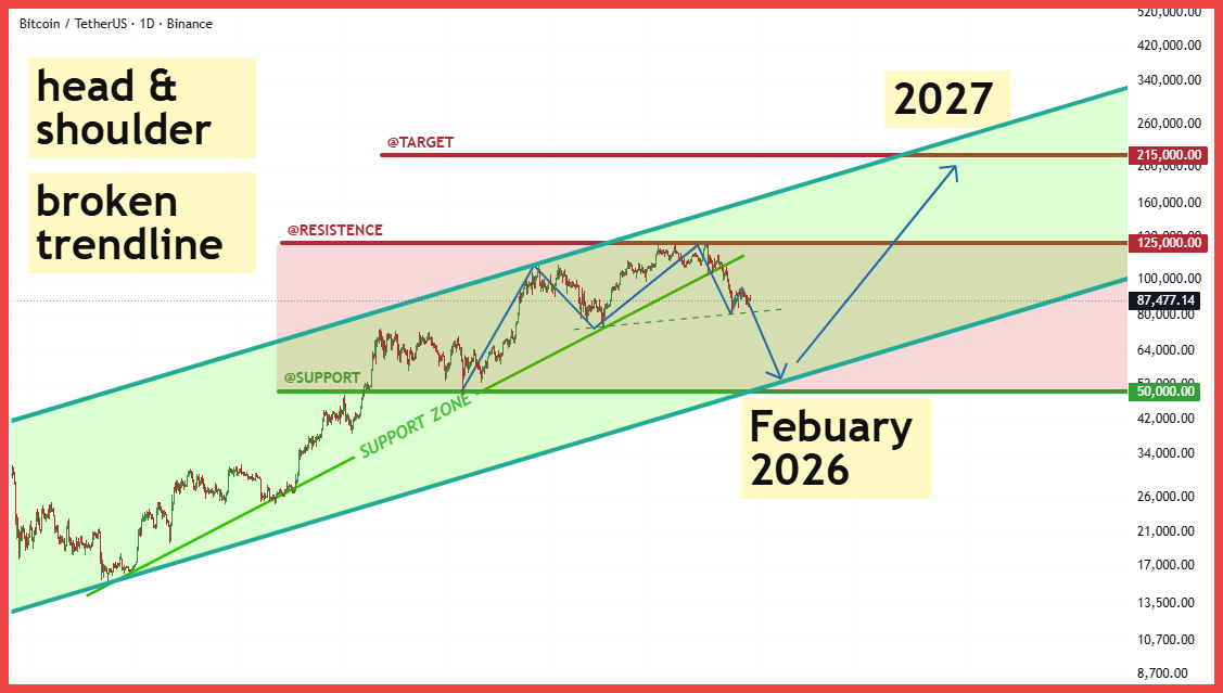 Phân tích Kỹ thuật: Giá $BTC đang di chuyển trong một kênh xu hướng tăng lớn kéo dài nhiều năm. Hiện tại, sau khi chạm đỉnh tạm thời, giá đã phá vỡ đường trendline hỗ trợ ngắn hạn và có dấu hiệu đang hoàn thành vai phải của mô hình Vai Đầu Vai tiềm năng. Vùng kháng cự cứng gần nhất là $125,000. Nếu mô hình này được xác nhận, chúng ta có thể thấy một cú giảm mạnh về vùng Hỗ trợ Vàng (SUPPORT ZONE) là $50,000 vào khoảng tháng 2 năm 2026. Đây là đáy của kênh xu hướng dài hạn và là điểm tích lũy tuyệt vời.