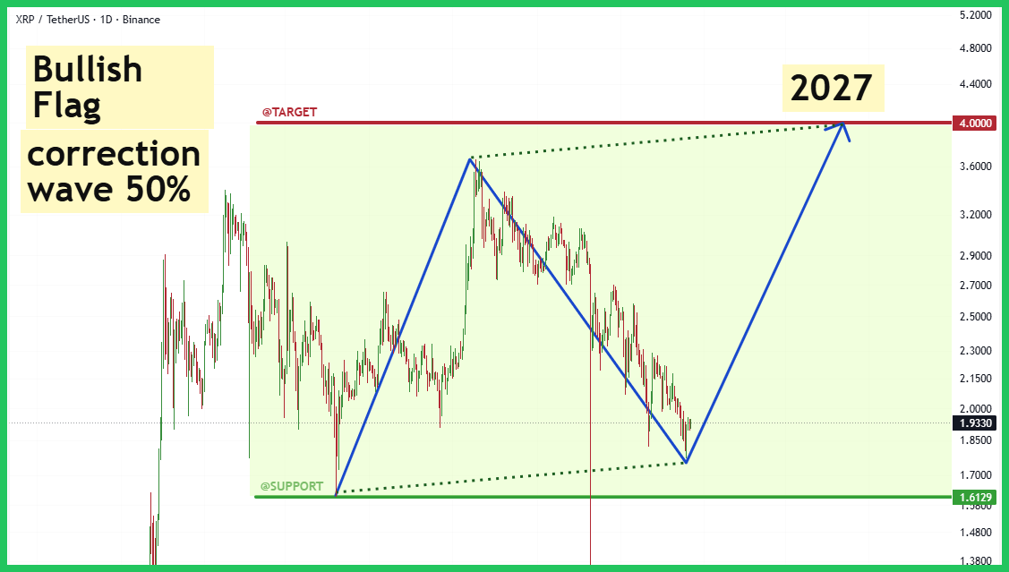 Trên khung thời gian D1, $XRP đang hoàn thiện mô hình Cờ Bò khổng lồ. Giá đã điều chỉnh về mức Fib 50% của đợt tăng trưởng trước, hiện đang dao động quanh mức $1.93. Vùng hỗ trợ cực kỳ quan trọng mà chúng ta cần theo dõi là $1.6129. Việc giữ vững trên mức này là tín hiệu xác nhận cho kịch bản tăng giá.