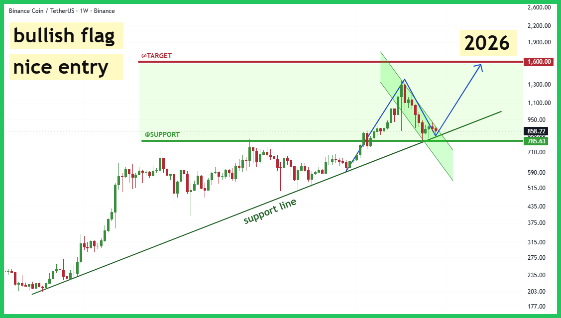 Chiến lược là tích lũy $BNB trong vùng hỗ trợ hiện tại. Cần quản lý rủi ro và cắt lỗ nếu giá đóng nến 1W dưới mức $750.