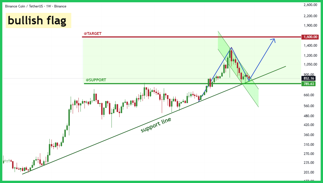 Ok anh em, cùng mổ xẻ chart $BNB cực ngon này xem có gì hay ho không nhé. Trên khung Tuần (1W), $BNB đang thể hiện sức mạnh tuyệt vời. Sau đợt tăng trưởng mạnh mẽ, giá đang điều chỉnh trong một kênh dốc xuống, hình thành mô hình Cờ Tăng (Bullish Flag) kinh điển.