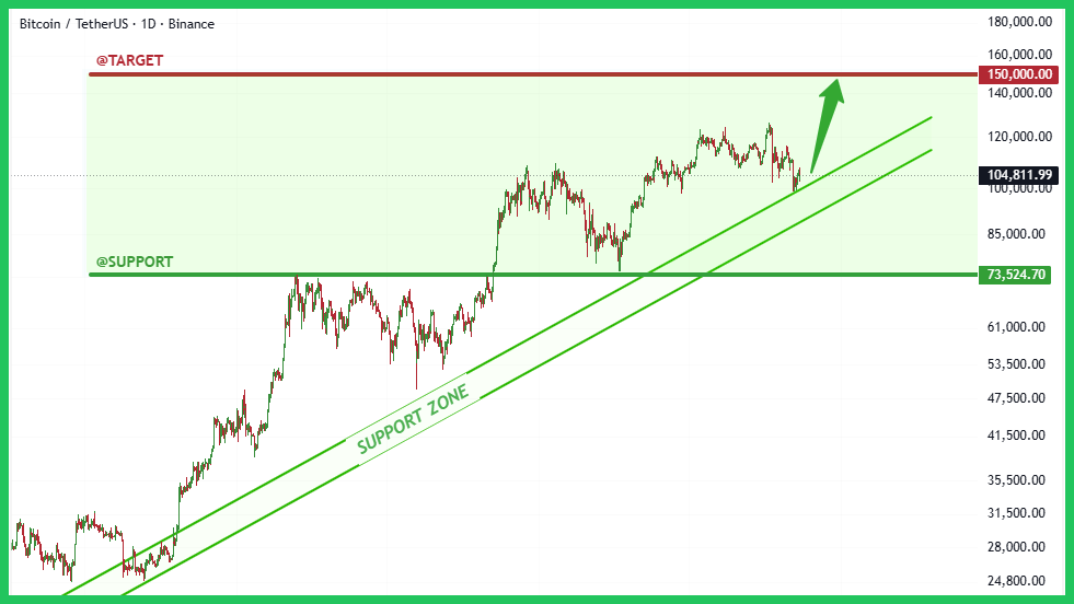 Phân tích Kỹ thuật: Trên khung D1, $BTC đang giữ vững trong một kênh xu hướng tăng rất rõ ràng. Sau đợt điều chỉnh vừa rồi, giá đã chạm vào đường hỗ trợ dưới của kênh (quanh mốc $100,000 - $104,000) và đang có phản ứng tích cực, thể hiện qua cây nến rút chân tại vùng này. Đây là một điểm vào lệnh lý tưởng nếu anh em tin vào sự tiếp diễn của xu hướng tăng. Mức hỗ trợ cứng tiếp theo nếu kênh bị phá vỡ là $73,500. Mục tiêu (Target) tiếp theo là vùng kháng cự lịch sử quanh $150,000.