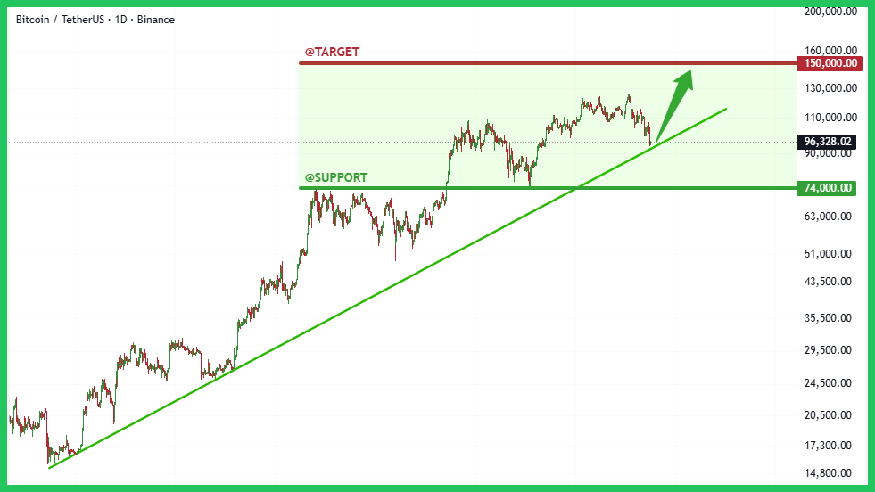 Về mặt kỹ thuật, chúng ta thấy giá $BTC đã giảm nhẹ về sát đường xu hướng tăng lớn (Uptrend Line) kéo dài. Hiện tại, khu vực quanh $96,000 đang đóng vai trò là điểm giao thoa giữa giá hiện tại và dynamic support (hỗ trợ động). Mức hỗ trợ cứng quan trọng nhất cần theo dõi là $74,000. Nếu $BTC giữ vững trendline này, mục tiêu tiếp theo chắc chắn là vùng kháng cự $150,000, nơi chúng ta có thể chốt lời một phần.