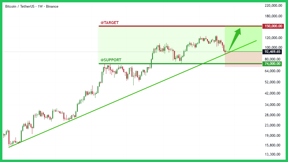 Phân tích Kỹ thuật trên khung W1 chỉ ra rằng Bitcoin đang điều chỉnh về khu vực hỗ trợ cực kỳ quan trọng, trùng với đường trendline tăng trưởng lịch sử. Giá hiện tại khoảng $92,000, là khu vực tích lũy lý tưởng. Nếu giá giữ vững trên ngưỡng này, đà tăng sẽ được tiếp diễn. Mức hỗ trợ cuối cùng chúng ta cần theo dõi là $74,000. Đây cũng là điểm cắt lỗ hợp lý cho vị thế long-term. Mục tiêu lợi nhuận tiếp theo được xác định rõ ràng là $150,000.