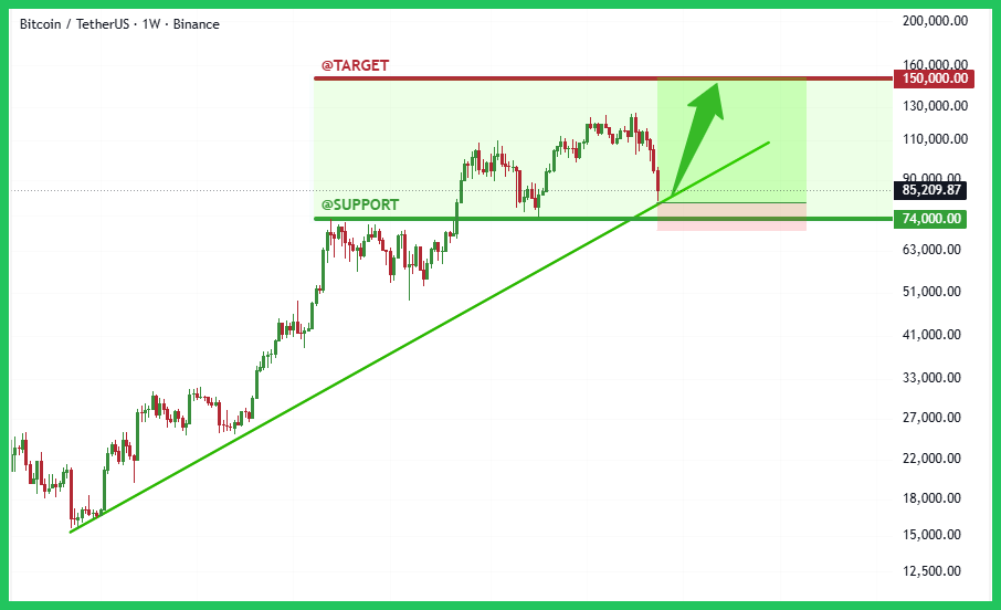 Về mặt Kỹ thuật, khu vực $74,000 không chỉ là vùng hỗ trợ ngang (vùng kháng cự cũ bị phá vỡ) mà còn là nơi giao nhau với đường xu hướng tăng dài hạn. Đây là điểm retest kinh điển (Support Flip) và là vùng mua tiềm năng cực kỳ lớn. Nếu $BTC giữ vững được mốc này, chúng ta hoàn toàn có thể kỳ vọng vào cú bật mạnh mẽ tiếp theo với mục tiêu là vùng kháng cự tâm lý và kỹ thuật $150,000.