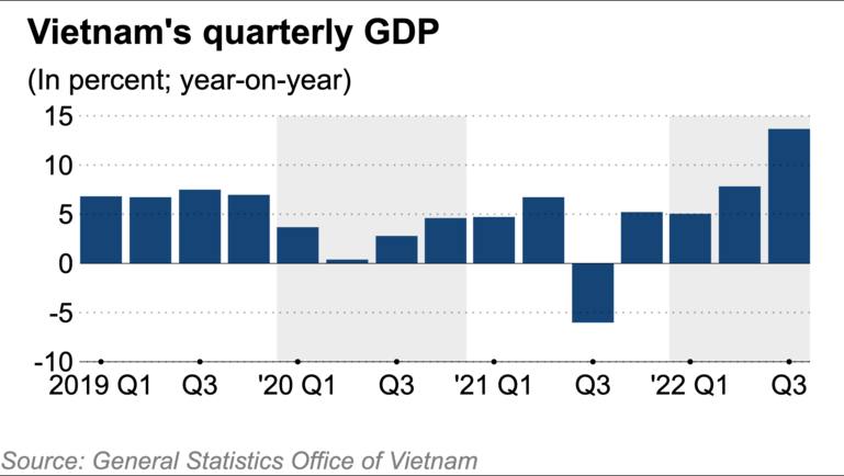 Sự phục hồi của tăng trưởng kinh tế năm 2022 là khởi đầu của chu kỳ kinh tế 4 năm 2021 – 2024 với mức nền thấp của năm 2021. Tổng sản phẩm trong nước (GDP) hàng quý tăng lần lượt 5,1%, 7,8%, 13,7%, 5,9% so với cùng kỳ năm trước. Tính chung cả năm 2022, tăng trưởng GDP ước đạt 8,02%. Kinh tế Việt Nam được đánh giá là điểm sáng của khu vực trong năm 2022. Tăng trưởng GDP của 3 quý đầu năm luôn ở mức cao: Việt Nam (5,1%, 7,8%, 13,7%), Philippines (8,2%, 7,5%, 7,6%), Malaysia (5,0%, 8,9%, 14,2%), Indonesia (5,0%, 5,4%, 5,7%), Thái Lan (2,3%, 2,5%, 4,6%). Theo báo cáo triển vọng kinh tế thế giới tháng 10/2022 của Quỹ tiền tệ thế giới (IMF), kinh tế Việt Nam có triển vọng tăng trưởng cao trong năm 2022: Việt Nam (+7.0%yoy), Philippines (+6,5%yoy), Malaysia (+5,4%yoy), Indonesia (+5,3%yoy), Thái Lan (+2,8%yoy).