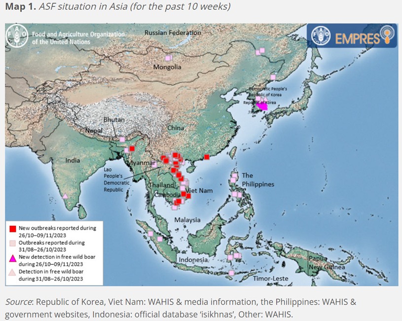 Dịch tả lợn Châu Phi được công bố tại 18 quốc gia sau từ Tháng 8/2018: Trung Quốc, Mông Cổ, Việt Nam, Campuchia, Cộng hòa Dân chủ Nhân dân Triều Tiên, Cộng hòa Dân chủ Nhân dân Lào, Myanmar, Philippines, Hàn Quốc, Timor-Leste, Indonesia, Papua New Guinea, Ấn Độ, Malaysia, Bhutan, Thái Lan, Nepal và Singapore.