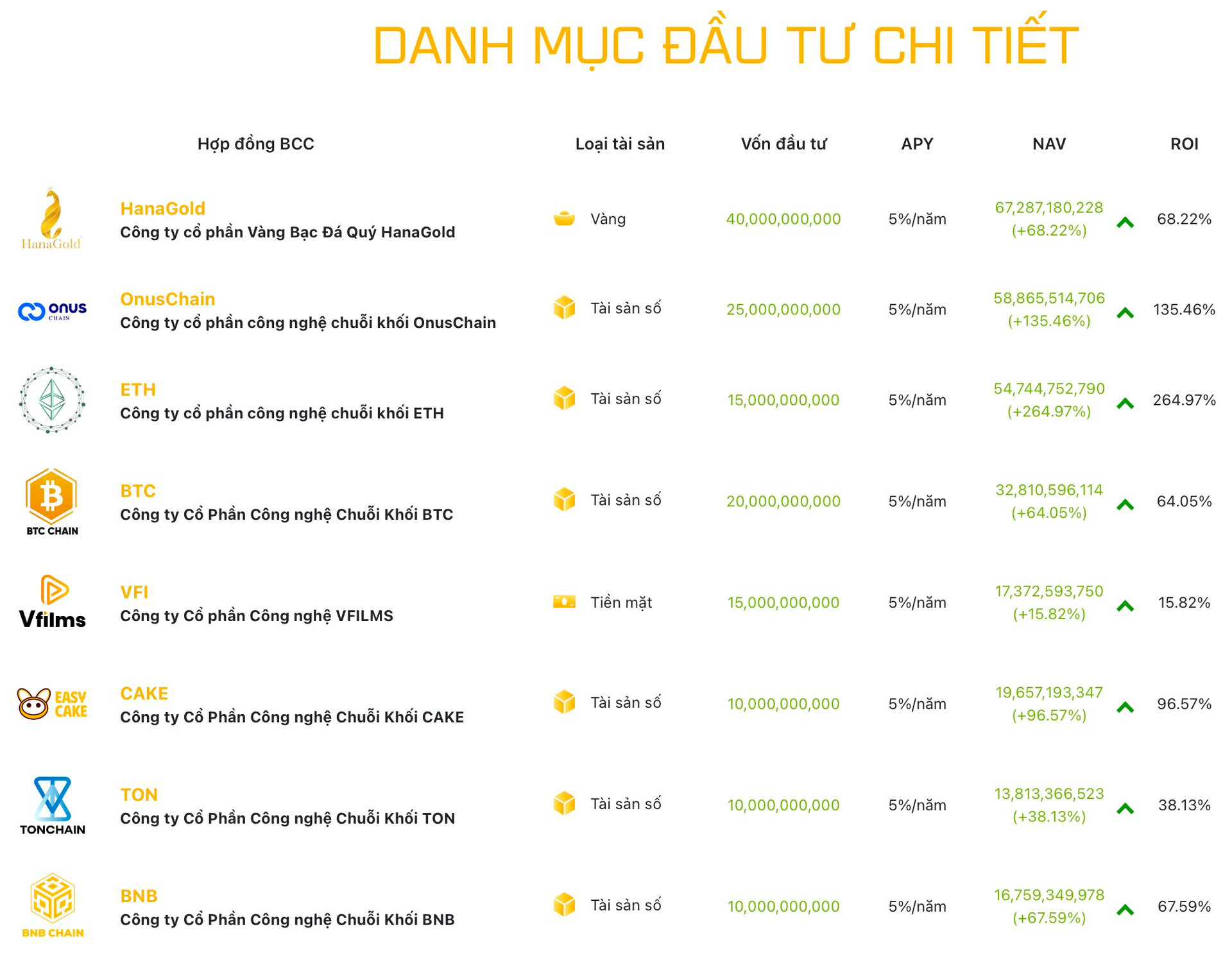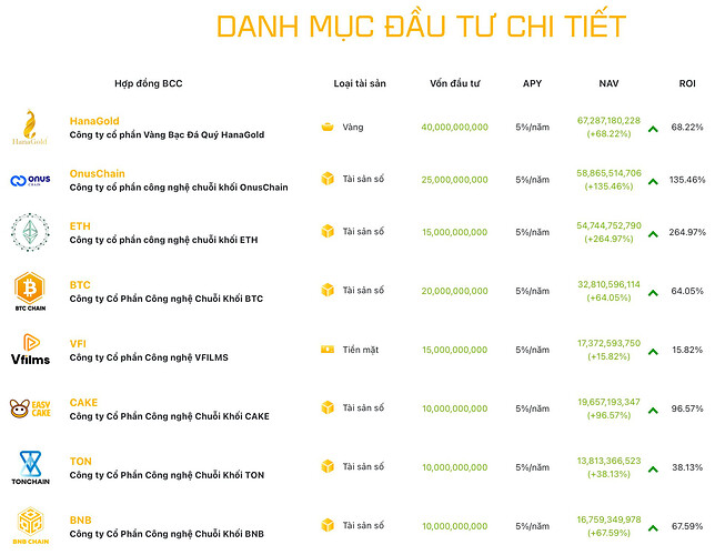 Đáng chú ý, danh mục đầu tư chi tiết do HVA công bố trên website là các Hợp đồng BCC trên các loại tài sản gồm vàng, tiền mặt và đặc biệt là tài sản số. Đối tác của HVA là CTCP công nghệ chuỗi khối ETH, CTCP Công nghệ Chuỗi Khối BTC, CTCP Công nghệ Chuỗi Khối BNB,… Có thể thấy, tên của các pháp nhân này khiến nhà đầu tư dễ liên tưởng đến các loại tài sản số phổ biến như Bitcoin, Ethereum, Binance…