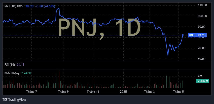 Trên thị trường chứng khoán, cổ phiếu PNJ đã chứng kiến đà tăng mạnh mẽ nhiều phiên liên tiếp. Hiện, PNJ tiếp tục giao dịch khởi sắc, có thời điểm chạm trần trong phiên sáng 13/5 lên mức giá 84.100 đồng/cp, cao nhất trong vòng hơn 1 tháng qua.