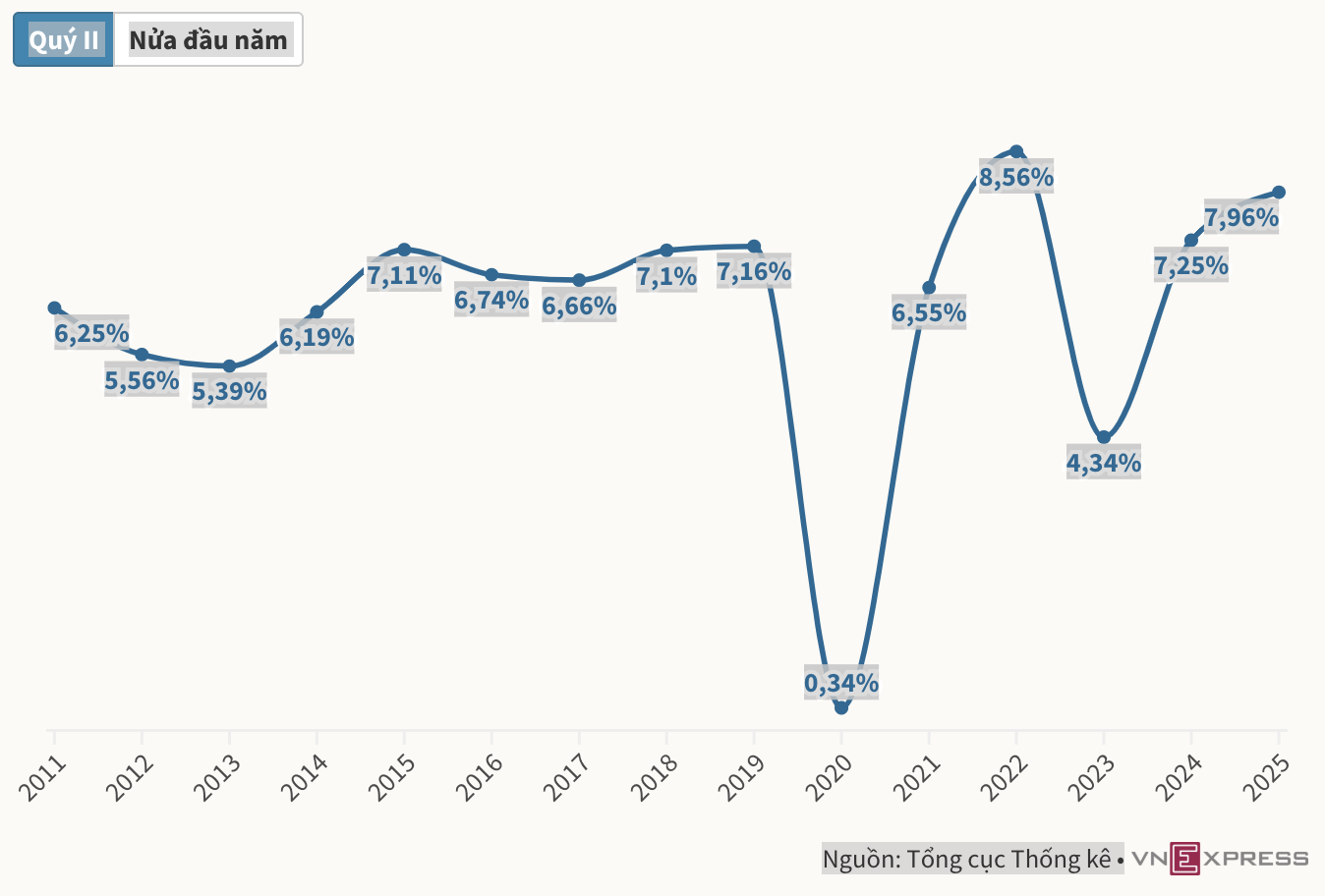 Tốc độ tăng trưởng kinh tế quý II ước đạt 7,96%, tăng cao thứ hai trong giai đoạn 2020-2025.