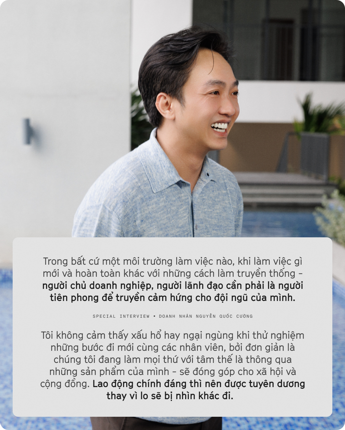 Tôi thì nghĩ đơn giản thế này: Trong bất cứ một môi trường làm việc nào, khi làm việc gì mới và hoàn toàn khác với những cách làm truyền thống - người chủ doanh nghiệp, người lãnh đạo cần phải là người tiên phong để truyền cảm hứng cho đội ngũ của mình. Tôi không cảm thấy xấu hổ hay ngại ngùng khi thử nghiệm những bước đi mới cùng các nhân viên, bởi đơn giản là chúng tôi đang làm mọi thứ với tâm thế là thông qua những sản phẩm của mình - sẽ đóng góp cho xã hội và cộng đồng. Lao động chính đáng thì nên được tuyên dương thay vì lo sẽ bị nhìn khác đi.