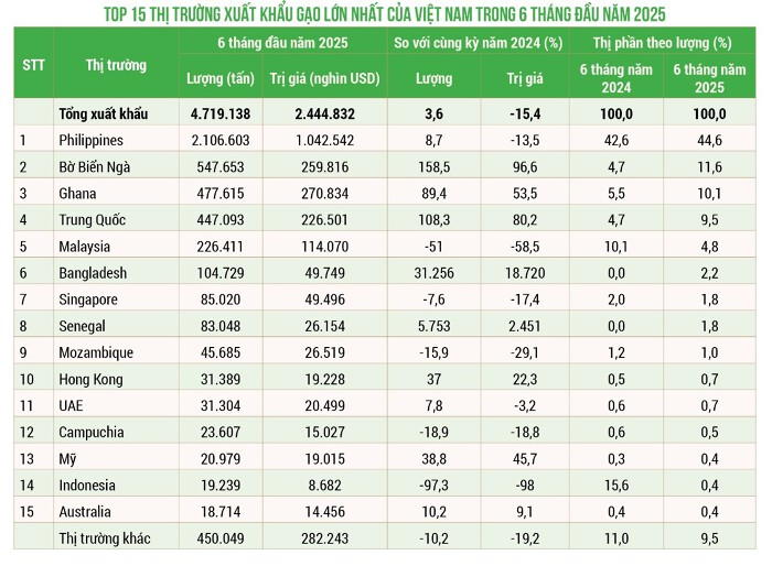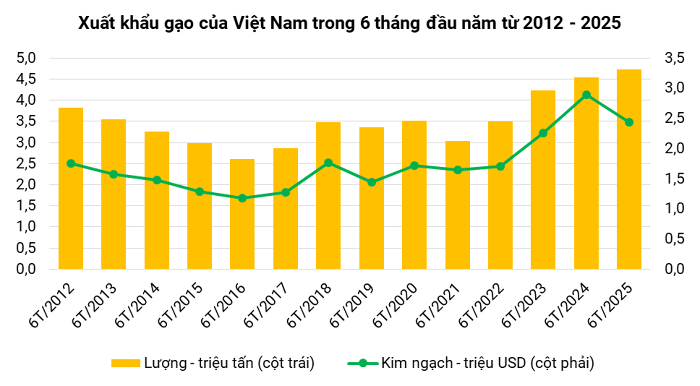 Theo số liệu của Cục Hải quan, trong 6 tháng đầu năm, xuất khẩu gạo của Việt Nam đạt kỷ lục (xét trong cùng giai đoạn ở các năm) hơn 4,7 triệu tấn, với kim ngạch thu về 2,44 tỷ USD, tăng 3,6% về lượng nhưng giảm 15,4% về kim ngạch so với cùng kỳ năm 2024.