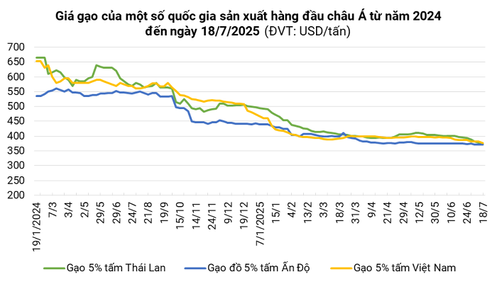 Dữ liệu từ Hiệp hội Lương thực Việt Nam (VFA) cho thấy, tính đến ngày 18/7, giá gạo 5% tấm của Thái Lan đang được chào bán ở mức 374 USD/tấn, giảm mạnh 23 USD/tấn so với tháng trước và là mức thấp nhất trong số các “ông lớn” ngành gạo là Ấn Độ, Việt Nam vàPakistan.