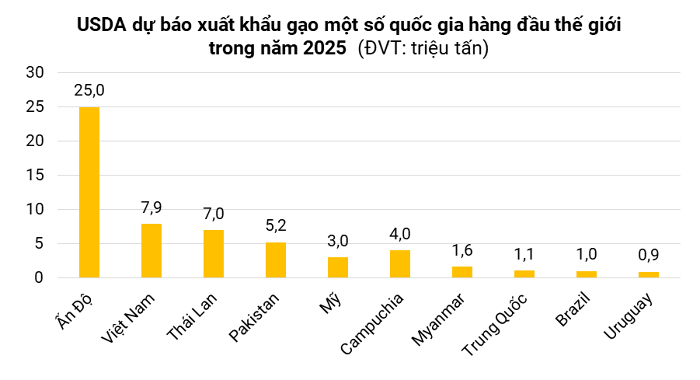 Trong báo cáo gần đây, Bộ Nông nghiệp Mỹ (USDA) dự báo xuất khẩu gạo của Thái Lan sẽ giảm xuống mức thấp nhất trong nhiều năm, chỉ còn 7 triệu tấn vào năm 2025 so với 9,9 triệu tấn của năm 2024. Trong khi đó, xuất khẩu gạo của Việt Nam được dự báo ở mức 7,9 triệu tấn và Ấn Độ là 25 triệu tấn.