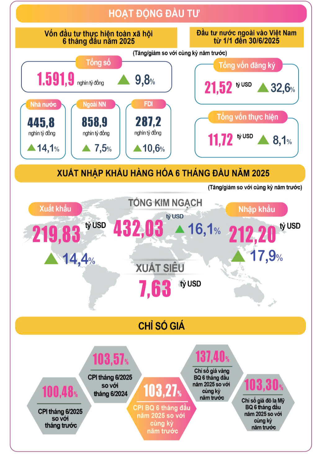 - Xuất khẩu tăng cao: Kim ngạch xuất khẩu hàng hóa 6 tháng đạt 219,83 tỷ USD tăng 14,4% . Cán cân thương mại xuất siêu 7,63 tỷ USD.