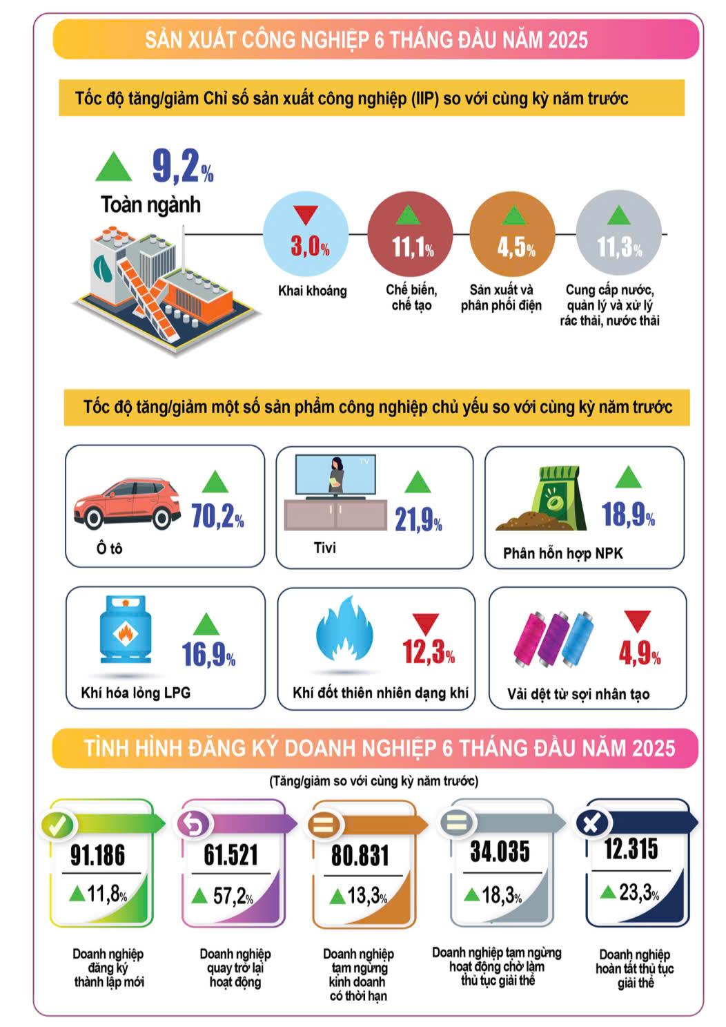 - Công nghiệp dẫn đầu: Chỉ số sản xuất công nghiệp tăng 9,2% . Ngành chế biến chế tạo tăng 11,1% , đóng góp 9,1 điểm % vào tăng trưởng chung.