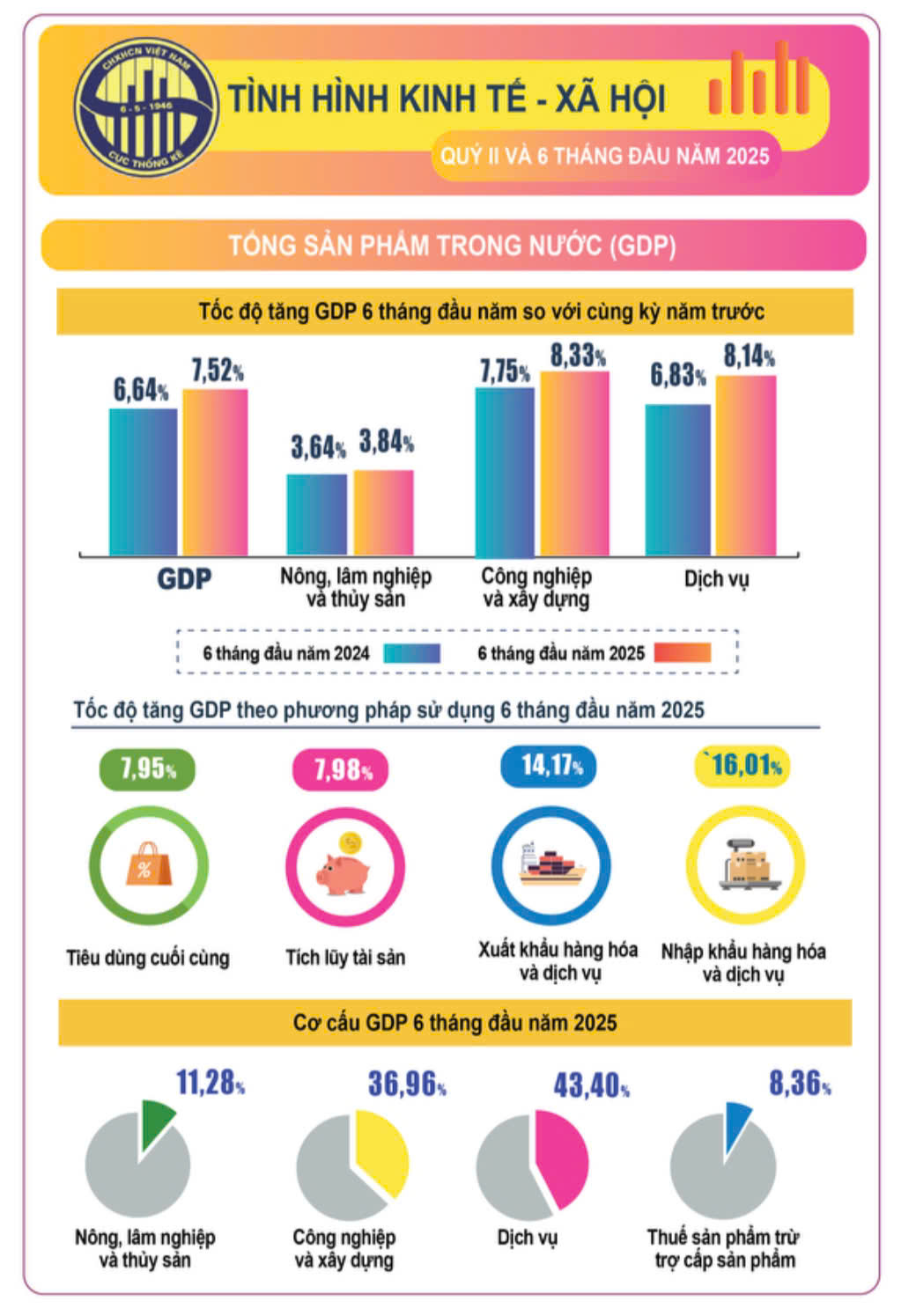 - Tăng trưởng kỷ lục : GDP 6 tháng đầu năm tăng 7,52% , mức cao nhất trong giai đoạn 2011-2025 . Quý 2 đạt 7,96% chỉ thấp hơn tốc độ tăng 8,56% của quý 2/2022 .