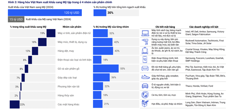 Nếu Việt Nam bị tăng thuế, những ngành công nghiệp chính sẽ bị ảnh hưởng và dễ bị tổn thương nhất là đồ điện tử, thiết bị máy móc, dệt may, giày dép và đồ gỗ. Các ngành này chiếm phần lớn kim ngạch xuất khẩu sang Mỹ, và nhiều doanh nghiệp có tỷ lệ doanh thu xuất khẩu phụ thuộc cao vào thị trường Mỹ. Tuy nhiên, kỳ vọng tác động sẽ phân hóa giữa các ngành và từng công ty. Các công ty đa quốc gia sản xuất điện tử và thiết bị máy móc tại Việt Nam có khả năng phản ứng với thuế quan tốt hơn bằng cách chuyển một phần hoạt động sản xuất hoặc hàng hóa hoàn thiện sang các quốc gia khác. Nhưng các nhà sản xuất nội địa về dệt may, giày dép và đồ gỗ có thể có ít lựa chọn để chuyển hướng và tìm thị trường tiêu thụ thay thế. Những doanh nghiệp phụ thuộc nhiều vào doanh số xuất khẩu sẽ phải đối mặt với chi phí cao hơn, số lượng đơn hàng giảm sút và dòng tiền hoạt động kém hơn.