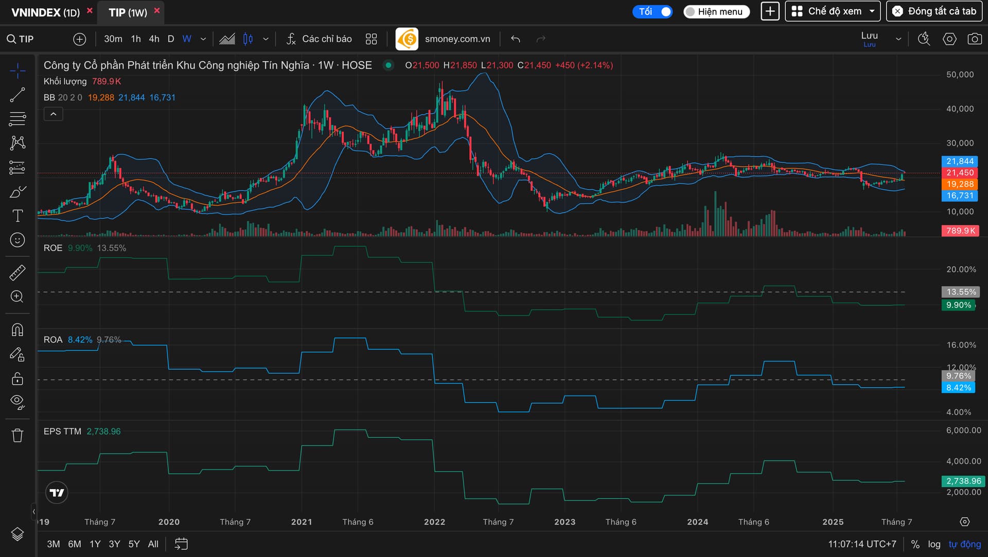 Tỷ lệ P/E của TIP là 7.77 và tỷ lệ P/B là 0.93, cho thấy cổ phiếu này đang có mức định giá hấp dẫn. Trên đồ thị việc dòng tiền vào kéo cổ phiếu break 25 và retest với thanh khoản siết cung cho thấy tín hiệu tốt.