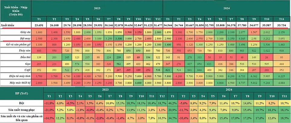 Nhìn vào bức tranh tổng thể về tình hình xuất khẩu của Việt Nam và chỉ số sản xuất công nghiệp (IIP), ngành dệt may Việt Nam đã chứng kiến một sự hồi phục mạnh mẽ trong năm 2024. Cụ thể, quý III vừa qua đánh dấu bước đột phá đáng chú ý, khi kim ngạch xuất khẩu dệt may lần đầu tiên vượt mức đỉnh của năm 2022. Nhìn về giá trị xuất khẩu của Giày da và Dệt may có thể thấy rõ sự phục hồi bắt đầu từ cuối quý 2 năm nay. Gang màu xanh đang dần chiếm phần đa số.