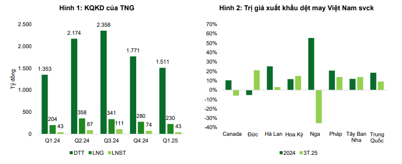 Giá xơ, sợi dệt nhập khẩu có dấu hiệu tăng trở lại từ đầu năm 2025, trong khi giá nhập khẩu hàng dệt may của Mỹ từ Việt Nam tiếp tục đà giảm từ tháng 8/2024. Ngoài ra, một số khách hàng đã đề xuất giảm giá bán thêm 2% do họ chấp nhận chịu mức thuế 10% tăng thêm nhằm tránh việc phải tăng giá đến tay người tiêu dùng. Với biên lợi nhuận vốn đã khá mỏng, TNG chỉ có thể giảm tối đa 2%, và hiện đang chấp nhận giảm 1% giá bán. Do đó, biên lợi nhuận gộp của TNG có thể thu hẹp nhẹ so với năm 2024.