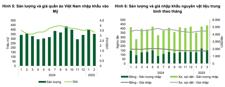 - Biên lợi nhuận gộp có thể giảm: Giá xơ, sợi dệt nhập khẩu có dấu hiệu tăng trở lại từ đầu năm 2025, trong khi giá nhập khẩu hàng dệt may của Mỹ từ Việt Nam tiếp tục đà giảm. Bên cạnh đó, một số khách hàng đề xuất giảm giá bán trong bối cảnh thuế nhập khẩu của Mỹ tăng.