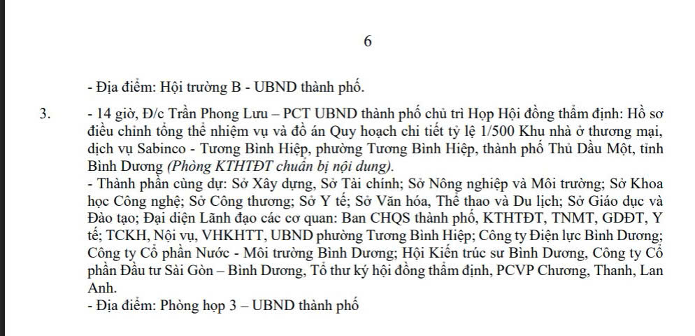 Thông tin bên lề cuộc họp chiều 20/3/2025.UBND tỉnh Bình Dương đã ban hành các quyết định về phê duyệt kế hoạch sử dụng đất đai năm 2025 cho tp Thủ Dầu Một, trong đó có liên quan đến dự án Sabinco như: Thu hồi 2.34 ha đất công xen kẹt và chuyển mục đích 2.85 ha còn lại sang đất đô thị. Các thành viên dự họp đã nghe và thống nhất các nội dung quan trọng như: Bỏ 2.34 ha đất công ra khỏi quy hoạch, đồng thời bố sung thêm 2.85 ha còn lại vào quy hoạch, tổng thể dự án vẫn là 19.3 ha; Đồ án quy hoạch chi tiết tỷ lệ 1/500 mới không bao gồm 2.34 ha xen kẹt… do vậy, thời gian cấp Giấy phép xây dựng chỉ tính bằng… tuần thui!