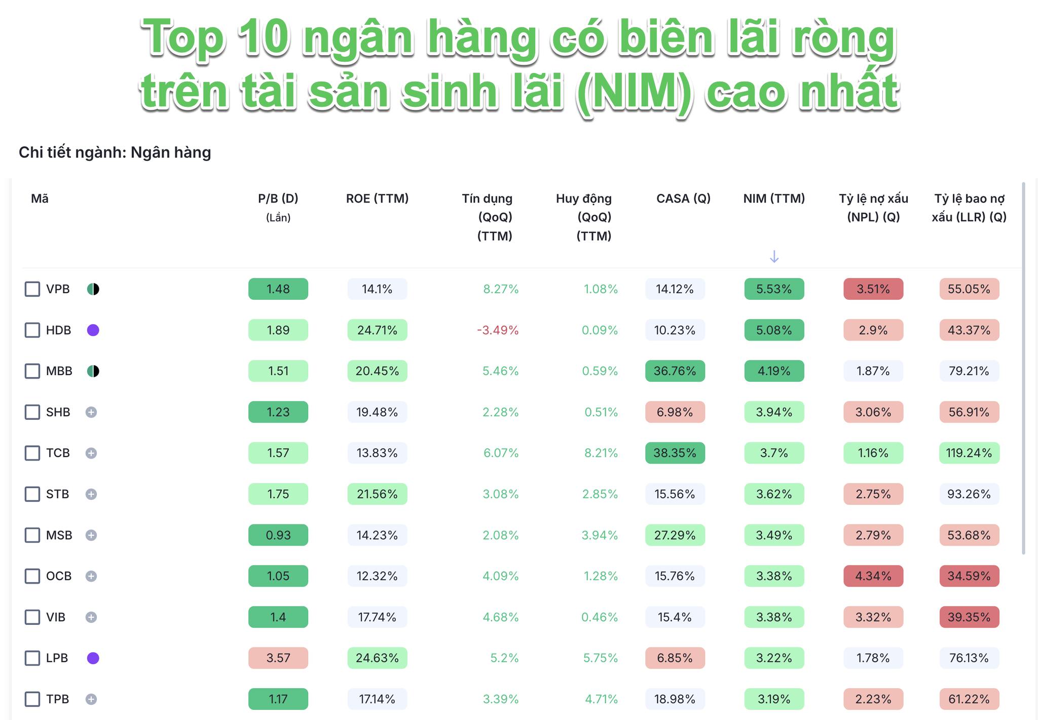 Top 10 ngân hàng có biên lãi ròng trên tài sản sinh lãi cao nhất - ranking theo NIM cao
