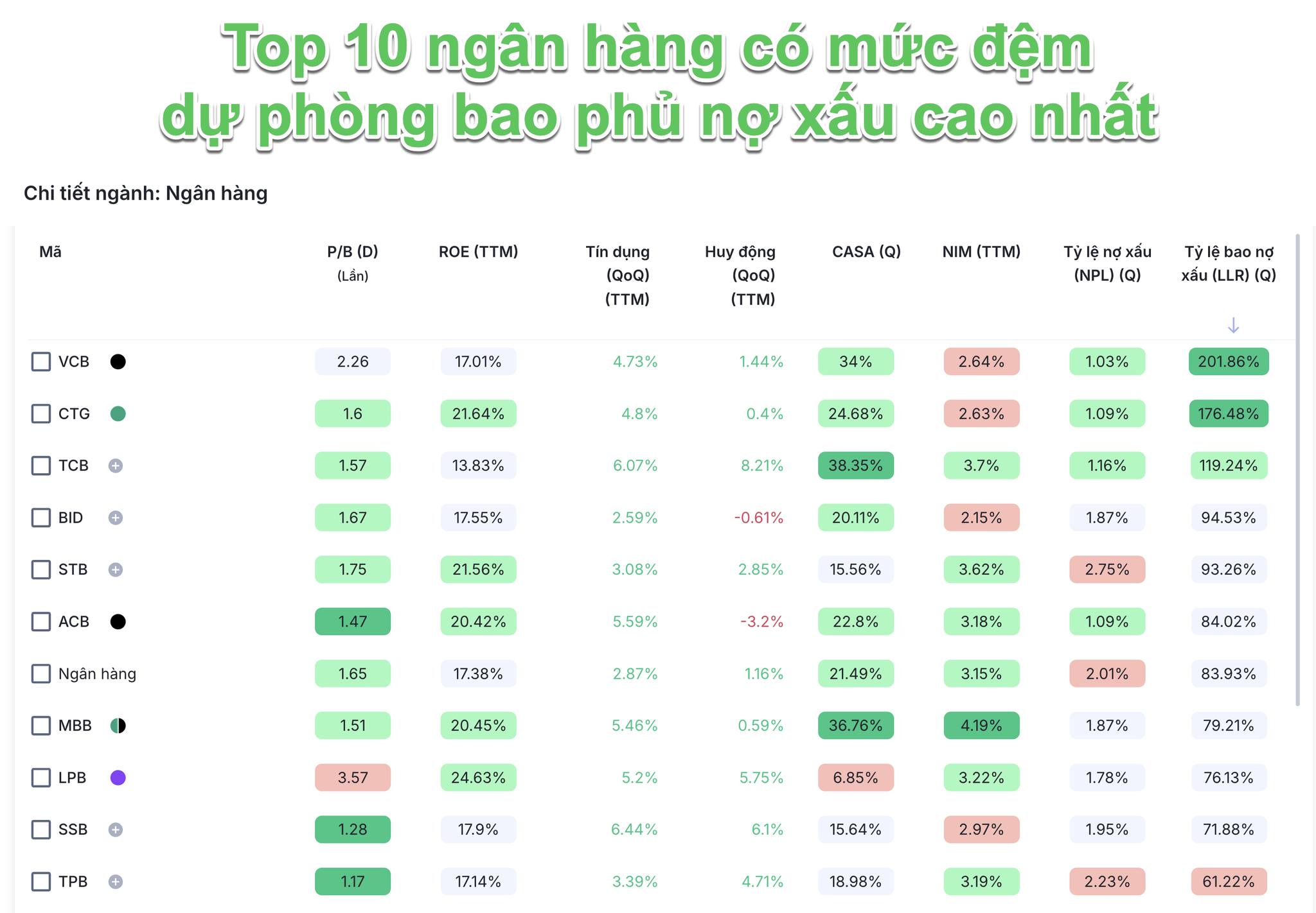 Top 10 ngân hàng có mức đệm dự phòng bao phủ nợ xấu cao nhất — ranking theo LLR/NPL cao