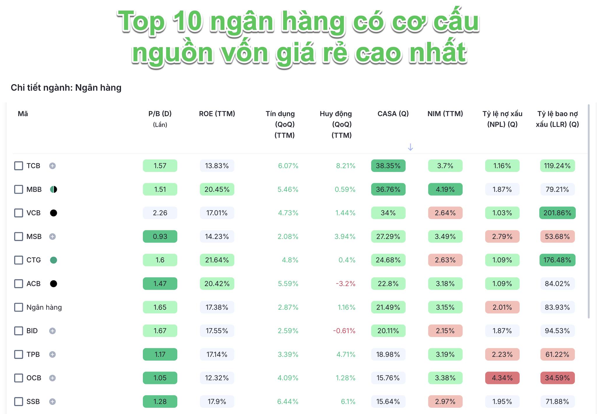 Top 10 ngân hàng có cơ cấu nguồn vốn giá rẻ cao nhất — ranking theo CASA cao