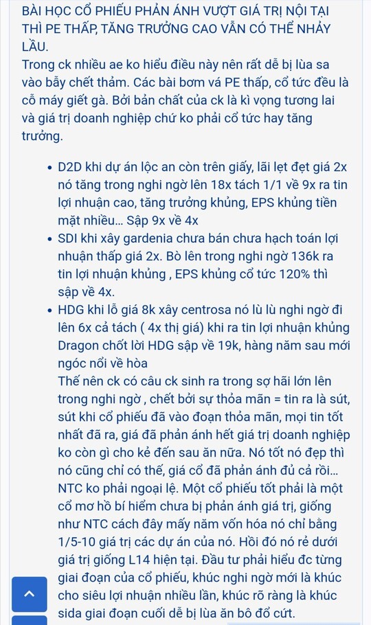 Có 2 cách kiếm tiền khi đầu tư cổ phiếu: 1. Đầu tư vào DN tăng trưởng, ngon, trả cổ tức đều đặn hàng năm 2. Kiếm tiền dựa vào chênh lệch giá cổ phiếu NTC thuộc loại 1, L14 thuộc loại số 2, tuy nhiên khi đầu tư vào loại số 2 phải xác định XU HƯỚNG của cổ phiếu, xu hướng được tạo ra dựa trên kết quả kinh doanh doanh nghiệp. Câu hỏi đặt ra tại sao giá L14 lại rớt thảm từ 100 xuống 71, đương nhiên dựa trên kỳ vọng KQKD. Các con gà vào L14 đều kỳ vọng NMP rồi thất vọng, kết quả kinh doanh L14 liên tục đi xuống trong 3 năm, 2019 80 tỷ, 2020 35 tỷ, 2021 thậm chí giảm còn 28 tỷ, với NMP còn chưa giải phóng mặt bằng thì 2022 chắc chắn L14 sẽ lỗ nặng, chu kỳ L14 nếu có làm NMP chắc từ năm 2024 trở đi. L14 còn giữ được giá này là do có A7 cầm đầu cặm cụi ngày đêm vào các diễn đàn Pr lùa gà do hắn cầm lượng lớn L14, xả thì sập con mịa sàn không biết bao nhiêu phiên. Về TA thì L14 đã bước vào chu kỳ down trend với đỉnh sau thấp hơn đỉnh trước, đáy sau thấp hơn đáy trước, đường giá xuyên thủng MA50, những phiên bull vol thấp tè, đỏ vol to tướng, dòng tiền đang rút ra dần tuy nhiên ko dám bán số lượng lớn vì bán vậy thì tự tay bóp dái luôn. Anh em ai cầm con này hết sức cẩn trọng vì chỉ cần 1 lệnh bán kích hoạt ATC 5k trở lên sẽ dẫn đến cuộc tháo chạy của khá nhiều tài khoản lớn nhóm A7 và các con nhang.