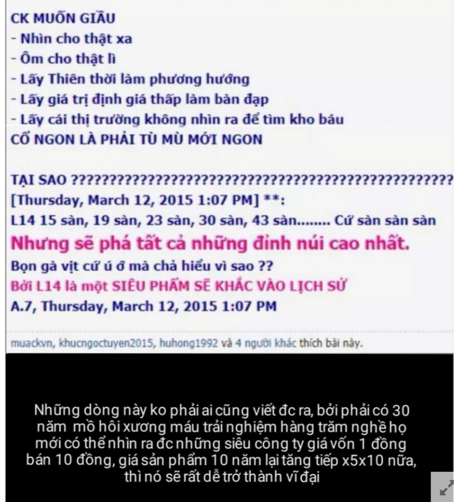 Thôi bác vẽ rồng rắn làm gì, L14 chỉ dành cho ai nhịn ăn được 6 năm nhân 10TK thế chết đói mẹ nó rồi, các bạn F0 chớ có dại đu vào nó ăn từ 2.000 lên 80.000 là 40 lần rồi, giờ dụ người khác mua để giữ giá, không ai mua là nó về lại 2.000 các bạn mua xong thầy trò L14 rút dần các bạn sẽ bị úp bô, đổ cứt đấy.