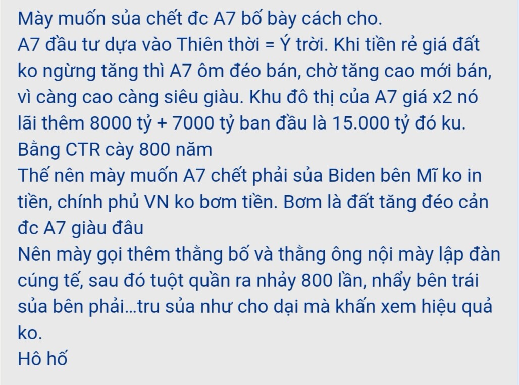 A7 đầu tư dựa vào Thiên thời = Ý trời. Khi tiền rẻ giá đất ko ngừng tăng thì A7 ôm đéo bán, chờ tăng cao mới bán, vì càng cao càng siêu giàu. Khu đô thị của A7 giá x2 nó lãi thêm 8000 tỷ + 7000 tỷ ban đầu là 15.000 tỷ đó ku. Bằng CTR cày 800 năm