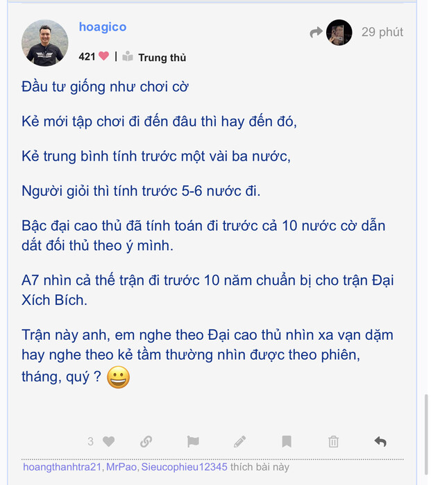từ khi nghe video A7 và đọc nhiều topic của A7 em đã thay đổi từ đầu cơ lướt sóng thành nắm giữ cp bđs. Và nav đã lên mấy tỉ ạ (nhờ HDC), em sẽ nắm giữ CEO. Em cảm ơn ạ. Mà đọc thấý A7 bị chửi oan quá.