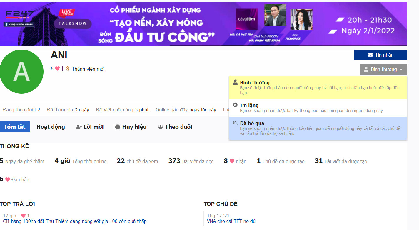 Đây bác, bác nhấn vào tên id, nhấn 2 cái này, ai không thích bỏ qua. Bỏ qua là mất tiêu luôn, không thấy id và cmt của họ luôn. Em cũng tập quen bỏ qua dần cho đỡ nhức đầu.