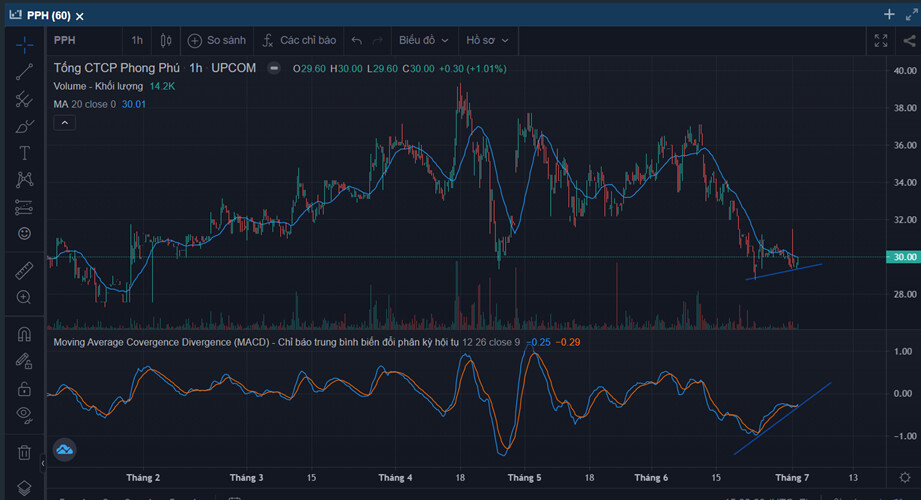 ở khung h1 ngày 01/07 có tín hiệu phân kỳ giữa giá và chỉ báo MACD, có thể mua 25% vào 04/07 nếu giá vượt lên trên MA 20. Vì cp có thanh khoảng khá thấp nên không phù hợp cho nhà đầu tư có vốn lớn.