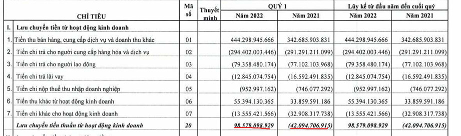 Lưu chuyển tiền từ hoạt động kinh doanh dương 98 tỷ trong khi đó Q1 2021 là -42 tỷ >> sức khỏe tài chính cty cái thiện rõ nét.